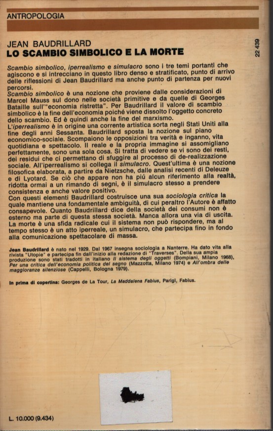 Scambio simbolico, iperrealismo e simulacro sono i tre temi portanti che agiscono e si intrecciano in questo libro denso e stratificato, punto di arrivo delle riflessioni di Jean Baudrillard ma anche di partenza per nuovi percorsi il termine “scambio simbolico” come nozione proviene dalle considerazioni di Marcel Mauss sul dono nelle società primitive e da quelle di Georges Battaille sull’”economia ristretta”. Per Baudrillard il valore di scambio simbolico è la fine dell’economia poiché viene dissolto l’oggetto concreto dello scambio e quindi anche la fine del maxismo.