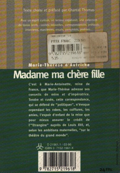 È a Maria Antonietta, che non è francese, che Maria Teresa rivolge i suoi consigli di madre e imperatrice. Tenera e astuta, questa corrispondenza, che nega di essere “politica”, si limita tuttavia a menzionare gli abiti, le acconciature, le amicizie della regina e la speranza di avere un figlio per meglio consolidare il credito della “Straniera” presso Luigi XVI e, secondo le ambizioni materne, “sulla scena dell’alta società”.