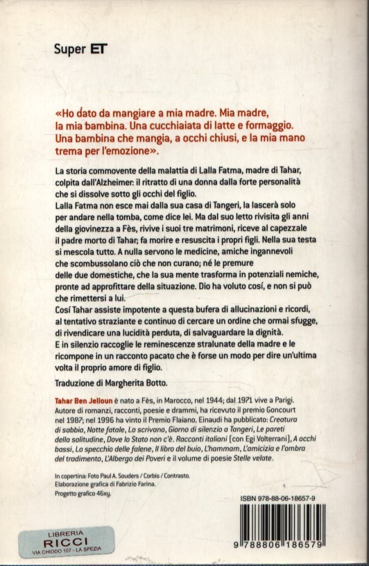 Ben Jelloun coglie con partecipazione gli atti e i pensieri della madre sofferente. L’Alzheimer che l’affligge non ha uno sviluppo lineare, il peggioramento è impercettebile, e spesso viene intervallato da momenti di lucidità in cui la madre scherza sul proprio male. Gli episodi descritti sono quelli dell’amnesia e confusione tipici della malattia; c’è la crisi dei figli, che oscillano tra l’angoscia e il rifiuto nel vedere la madre in quelle condizioni, nel vedere una persona che sbiadisce come una vecchia fotografia, si spegne, scompare. Una bufera di allucinazioni e ricordi, un tentativo straziante e continuo di cercare un ordine ormai sfuggente, di rivendicare una lucidità perduta, di salvaguardare la dignità. Una raccolta delle reminiscenze di una madre, ricomposte in un racconto pacato da parte di un figlio che dice un’ultima volta il suo amore di figlio.