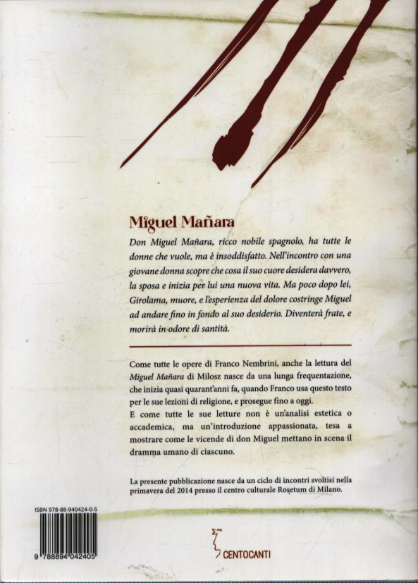 Don Miguel Mañara, ricco nobile spagnolo, ha tutte le donne che vuole, ma è insoddisfatto. Nell’incontro con una giovane donna scopre che cosa il suo cuore desidera davvero, la sposa e inizia per lui una nuova vita. Ma poco dopo lei, Girolama, muore, e l’esperienza del dolore costringe Miguel ad andare fino in fondo al suo desiderio. Diventerà frate, e morirà in odore di santità. Come tutte le opere di Franco Nembrini, anche la lettura del Miguel Mañara di Milosz nasce da una lunga frequentazione, che inizia quasi quarant’anni fa, quando Franco usa questo testo per le sue lezioni di religione, e prosegue fino a oggi. Come tutte le sue letture, non è un’analisi estetica o accademica, ma un’introduzione appassionata, tesa a ..