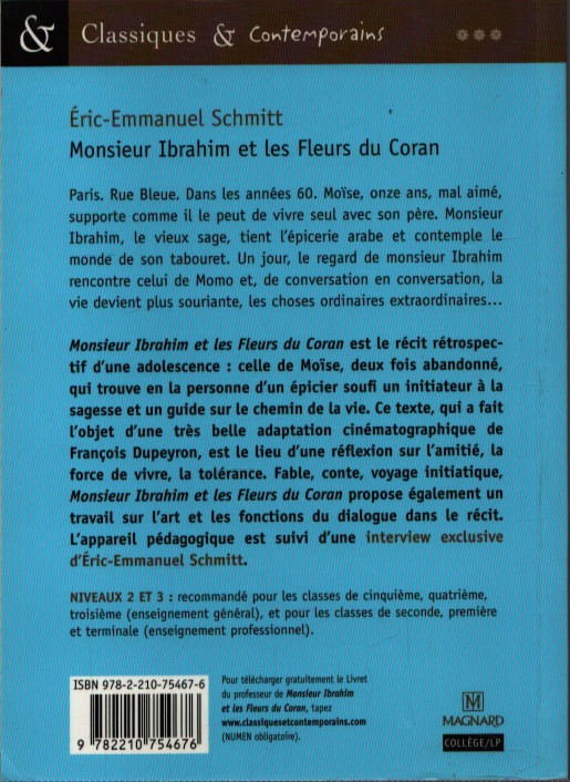 Parigi, anni ’60. Momo, un ragazzino ebreo di 12 anni, non amato, vive da solo con il padre. Ibrahim, il vecchio saggio, gestisce un negozio di alimentari arabo. Un giorno, i loro sguardi si incrociano… Questo testo, magistralmente adattato in un film da François Dupeyron, è uno spazio di riflessione sull’amicizia, la voglia di vivere, gli incontri e le fonti della tolleranza. In parte favola, in parte racconto, in parte racconto di formazione, Monsieur Ibrahim e i fiori del Corano offre anche un’esplorazione dell’arte e……