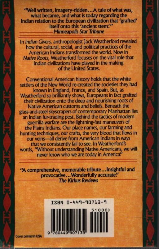 In Native Roots, Weatherford si concentra sul ruolo vitale che le civiltà indiane hanno svolto nella creazione degli Stati Uniti. La storia americana convenzionale sostiene che i coloni bianchi del Nuovo Mondo ricrearono le società che avevano conosciuto in Inghilterra, Francia e Spagna. Ma, come Weatherford mostra brillantemente, gli europei innestarono di fatto le loro civiltà sulle radici profonde e nutrienti dei costumi e delle credenze dei nativi americani. Sotto i grattacieli di vetro e acciaio della Manhattan contemporanea si cela un avamposto per il commercio di pellicce indiane. Dietro le tattiche della moderna guerriglia si celano le manovre fulminee degli Indiani delle Pianure. I nostri toponimi, le nostre tecniche di agricoltura e caccia, i nostri mestieri e il sangue stesso che scorre nelle nostre vene derivano tutti dagli Indiani d’America in modi che costantemente non riusciamo a vedere
