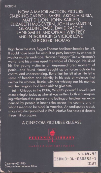 In Native Son, Wright racconta che i neri non godono della libertà dei bianchi. Descrive anche il movimento dei neri per protestare contro le politiche dei bianchi in America. Bigger Thomas è il personaggio principale di Native Son. Il conflitto all’interno del romanzo è il razzismo istituzionalizzato negli Stati Uniti, che si riflette nella diseguaglianza nell’istruzione, nella diseguaglianza nella giustizia e nella perpetuazione degli stereotipi sugli afroamericani nei vari media. Nell’ultima parte della storia, Bigger uccide accidentalmente Mary Dalton. Tuttavia, Bigger usa lo scopo politico come pretesto per nascondere il suo crimine. Sebbene Bigger tragga vantaggio dal suo crimine sconosciuto, viene comunque condannato a morte dal sistema giudiziario dei bianchi.