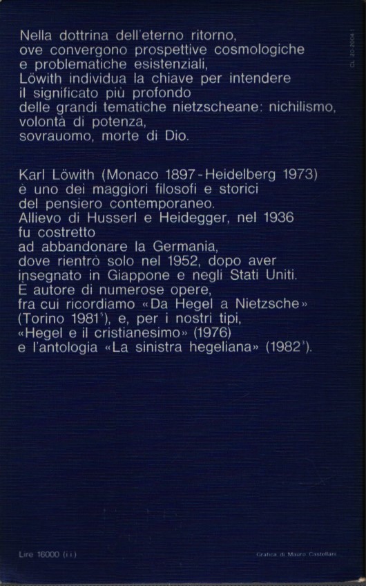 Nella dottrina dell’eterno ritorno, ove convergono prospettive cosmologiche e problematiche esistenziali, Löwith individua la chiave per intendere il significato più profondo delle grandi tematiche nietzscheane: nichilismo, volontà di potenza, sovrauomo, morte di Dio.