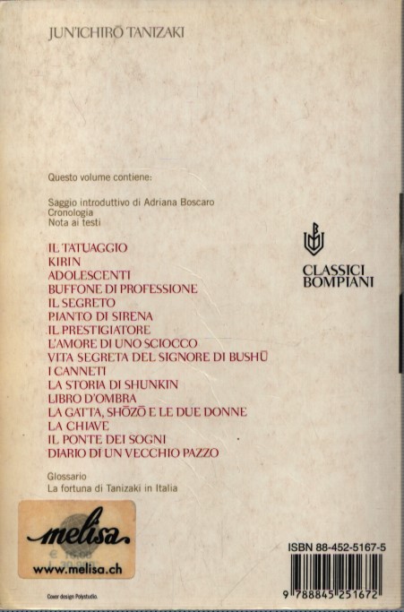 Tanizaki (1886-1965) fu esponente di una cultura letteraria orientale aperta agli influssi occidentali, senza però mai dimenticare le tradizioni specificamente giapponesi, come risulta dal suo famoso “Linea d’ombra”. Oscillando tra sensualità morbosa (intrisa di masochismo, di idealizzazione della donna-crudele, della donna-vampiro) e minuziosa analisi dei movimenti psichici, questo narratore ci offre storie ambigue e struggenti come “L’amore di uno sciocco”, “La chiave”, “Diario di un vecchio pazzo”.
