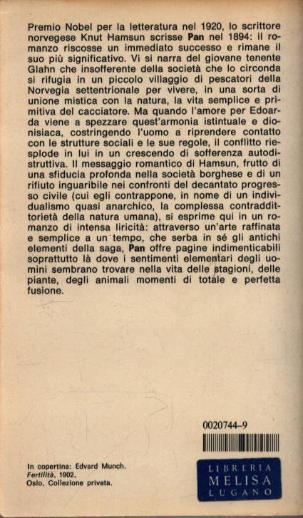 “Pan” è uno dei rari romanzi moderni in cui la natura parla, nella lingua sommessa e sognante della breve estate nordica, del suo chiarore diffuso e fosforico. Ed è, insieme, l’epos di un amore impossibile che si carica sempre più di esaltazione e struggimento. Pubblicato per la prima volta nel 1894, “Pan” divenne ben presto uno dei libri più amati di Hamsun. Il tenente Glahn, che nelle carte trovate dopo la sua morte racconta la sfortunata passione per la giovanissima Edvarda, diventa la voce stessa della passione, con le sue maree incontrastabili che invadono la natura tutta e creano un amalgama dove alla fine è arduo distinguere ciò che è paesaggio e ciò è psiche.