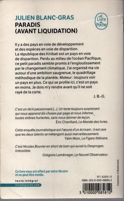 Un diario di viaggio su Kiribati, un paese dell’Oceania minacciato di estinzione a causa dei cambiamenti climatici. “Ci sono paesi in via di sviluppo e specie in via di estinzione. La Repubblica di Kiribati è un paese in via di estinzione. Perso nel mezzo dell’Oceano Pacifico, questo piccolo paradiso sembra destinato a essere inghiottito dai cambiamenti climatici. Ho organizzato la mia vita attorno a un’ambizione bizzarra: la mappatura metodica del pianeta. La mia forza trainante: vedere sempre un paese in più. Ciò che incombe qui è un paese in meno. Devo andarci prima che venga cancellato dalla mappa.”