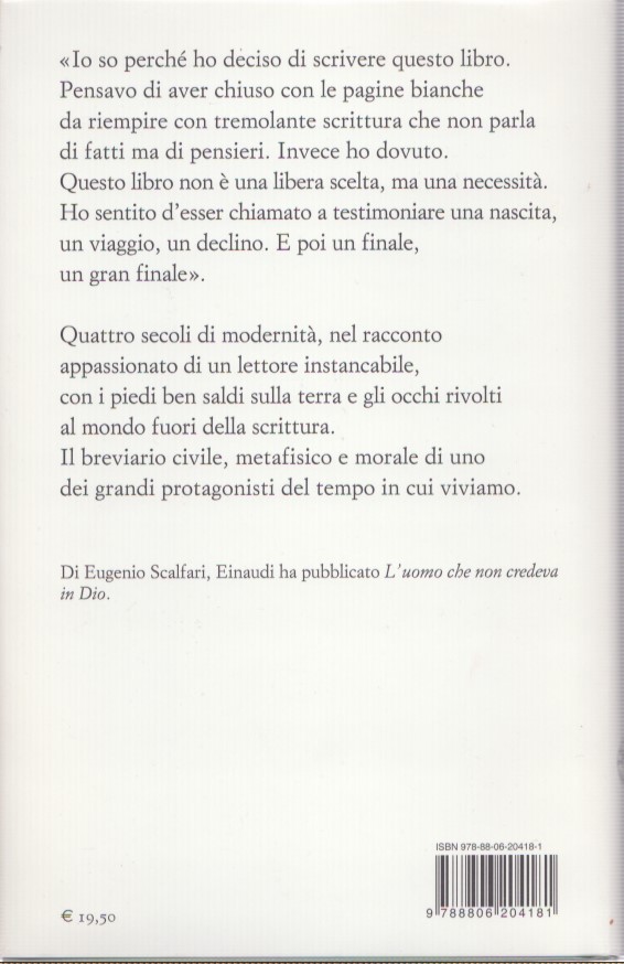 “Questo libro è la rivisitazione della modernità, da Montaigne e Cervantes fino a Leopardi e a Nietzsche, Descartes, Kant e Hegel, e ancora Tolstoj, Proust, Kafka e Joyce. Un’epoca durata quattro secoli, mai simile a se stessa, sempre in cerca di sperimentare il nuovo, di allargare il respiro delle generazioni, di modificare l’identità senza smarrire la memoria”. Così Eugenio Scalfari riassume, nell’epilogo che chiude il libro, il suo viaggio attraverso la modernità, che tocca, con un approccio stilistico che sta tra l’analisi e il racconto, le varie fasi dei tempi moderni, dall’Illuminismo al Romanticismo, dalle avanguardie al nichilismo, dalla razionalità allo scatenarsi delle emozioni e degli istinti. “La modernità – scrive Scalfari – è..