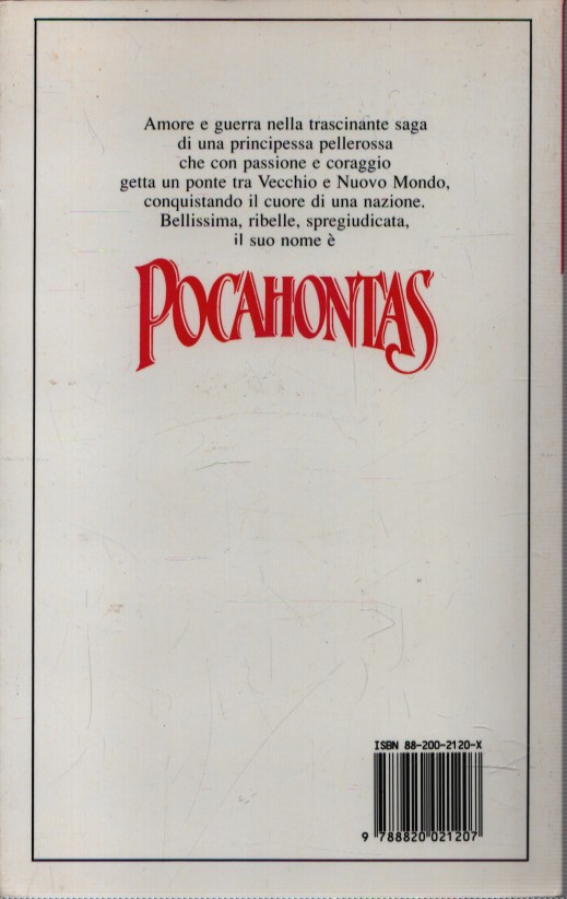 Dalle coste selvagge della Virginia all’animazione delle strade di Londra, la travolgente, impossibile storia d’amore tra una pellerossa e un ufficiale inglese. Agli inizi del Seicento, alcune navi di emigranti inglesi approdano in America per sconfiggere gli spagnoli, tradizionali nemici, nella lotta per la supremazia nel Nuovo Mondo. Ma ad accoglierli trovano una tribù di nativi, fieramente decisi a difendere dagli invasori le loro terre e le loro usanze. A mediare tra i due contendenti è la bellissima Pocahontas, la giovane figlia del capo Powhatan. E lì incontra l’affascinante John Smith, col quale è amore a prima vista. Un romanzo basato sulla vera storia della principessa indiana.