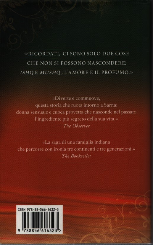 Generose manciate di spezie per lenire la nostalgia di casa; caldo yogurt piccante in cui dissolvere la vergogna per un errore inconfessabile; frittelle croccanti contro l’incertezza del presente: è in cucina che Sarna esercita la sua magia. Incantatrice di aromi, sa come annegare i brutti ricordi in fragranze inebrianti, e trovare nuove ricette per reinventarsi il passato. Si ribella così alle parole di sua madre, che l’aveva ammonita: “Ricordati, solo due cose non si possono nascondere: ishqz mushq, l’amore e il profumo”. Perché Sarna sa che, se usato con astuzia, il profumo può mascherare vecchi fantasmi d’amore. Quando è partita dall’India ha portato con sé ogni genere di utensile, oltre a tre casse di manghi (la sua passione proibita) e a una scorta quasi inesauribile di coriandolo, cannella e spezie di ogni tipo, incorrendo nelle lamentele di Karam, il suo neosposo, per quel bagaglio costoso e ingombrante..
