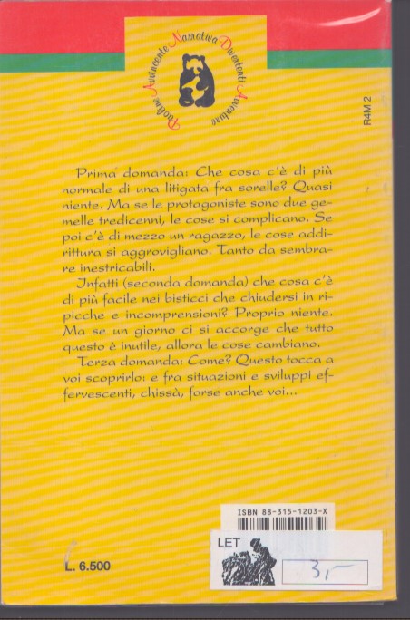 Che cosa c’è di più normale di una litigata fra sorelle? Quasi niente. Ma se le protagoniste sono due gemelle tredicenni, le cose si complicano. Se poi c’è di mezzo un ragazzo, le cose addirittura si aggrovigliano. Tanto da sembrare inestricabili. E che cosa c’è di più facile nei bisticci che chiudersi in ripicche e incomprensioni? Niente. Ma se un giorno ci si accorge che tutto questo è inutile, allora le cose cambiano. Come? Lo invita a scoprire T. Cristiani in questo racconto.