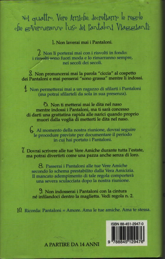 Si chiamano Lena, Tibby, Carmen e Bee e sono amiche da sempre, perfino da prima di nascere, perché le loro madri erano amiche quando le aspettavano. Sono diventate grandi insieme, ciascuna con la propria personalità, ciascuna bella a modo suo, speciale a modo suo. Poi arriva l’estate in cui devono separarsi per la prima volta. Un paio di jeans trovati in un negozio dell’usato saranno il loro legame per quelle vacanze: se li spediranno e li indosseranno a turno, e grazie ai magici pantaloni viaggianti saranno insieme anche se lontane, con mille storie da raccontarsi, in quella prima estate e in quelle che seguiranno.