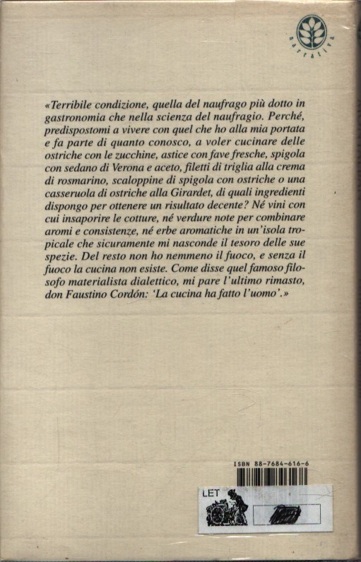 Nell’anno 2000 un novello Robinson Crusoe si ritrova, dopo un rocambolesco naufragio, a sopravvivere su un’isola deserta con a disposizione solo casse di baccalà sotto sale. Al protagonista-voce narrante non resta che abbandonarsi ad ardite disquisizioni esistenzial-filosofico-culinarie. Affamato di cibo e d’affetti, annientato dalla malinconia e dal ricordo della bella Muriel, risentito col mondo per la sua vuotaggine, Robinson-Montalban parla di cibo e di sesso, gioca con l’ironia e scherza con l’arte culinaria. Un romanzo-saggio breve ed efficace: un’opera raffinata e godereccia. Un Montalban accessibile, ironico e originale.
