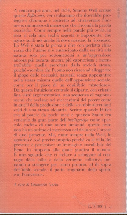 A venticinque anni, nel 1934, Simone Weil scrisse queste Riflessioni, vero talismano che dovrebbe proteggere chiunque è costretto ad attraversare l’immenso ammasso di menzogne che circonda la parola «società». Come sempre nelle parole più ovvie, in essa si cela una realtà segreta e imponente, che agisce su di noi anche là dove nessuno la riconosce. La Weil è stata la prima a dire con perfetta chiarezza che l’uomo si è emancipato dalla servitù alla natura solo per sottomettersi a un’oppressione ancora più oscura, ancora più capricciosa e incontrollabile: quella esercitata dalla società stessa, poiché «sembra che l’uomo non riesca ad alleggerire il giogo delle necessità naturali senza appesantire nella stessa misura quello dell’oppressione sociale, come per il gioco di un equilibrio misterioso».