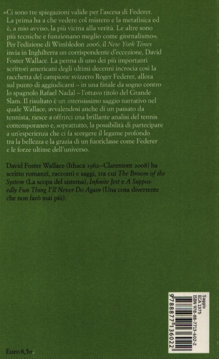 “Ci sono tre spiegazioni valide per l’ascesa di Federer. La prima ha a che vedere col mistero e la metafisica ed è, a mio avviso, la più vicina alla verità. Le altre sono più tecniche e funzionano meglio come giornalismo”. Per l’edizione di Wimbledon 2006, il New York Times invia in Inghilterra un corrispondente d’eccezione, David Foster Wallace. La penna di uno dei più importanti scrittori americani degli ultimi decenni incrocia così la racchetta del campione svizzero Roger Federer, allora sul punto di aggiudicarsi – in una finale da sogno contro lo spagnolo Rafael Nadal – l’ottavo titolo del Grande Slam. Il risultato è un intensissimo saggio narrativo nel quale Wallace, avvalendosi anche di un passato da tennista, riesce a offrirci una brillante analisi del tennis contemporaneo e, soprattutto, la possibilità di partecipare a un’esperienza che ci fa scorgere il legame profondo tra la bellezza e la grazia di un fuoriclasse come Federer e le forze ultime dell’universo.