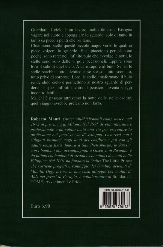 Guardare il cielo è un lavoro molto faticoso. Bisogna vagare nel vuoto e appoggiare lo sguardo solo di tanto in tanto su piccoli punti che brillano. Chiamiamo stelle queste piccole magie verso le quali ci piace volgere lo sguardo. E ci piacciono perché sono poche, sono rare: nell’infinito buio che avvolge le notti, le stelle sono solo delle virgole occasionali. A dare sapore al buio. Senza le stelle sarebbe tutto identico a se stesso, tutto scontato, tutto privo di sorprese. Loro, le stelle, trasformano il buio rendendolo cielo e permettono al nostro sguardo di perdersi in spazi infiniti mentre il pensiero inventa viaggi incontrollabili. Ma chi è passato attraverso la notte delle stelle cadute quel viaggio avrebbe preferito non farlo.