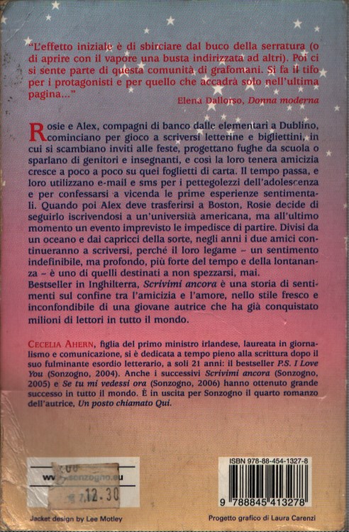 Rosie e Alex si conoscono sui banchi di una scuola di Dublino e iniziano a scriversi messaggi su biglietti di carta. A poco a poco diventano inseparabili fino a quando quelle lettere tradiscono un sentimento nuovo, che li confonde e li appassiona. Un amore impossibile da esprimere, con tutte le contraddizioni tipiche di quell’età. Ma quando i due prendono coscienza di ciò che li lega veramente, Alex deve abbandonare Rosie e trasferirsi con la sua famiglia negli Stati Uniti. Straordinario collage di lettere, e-mail, bigliettini, sms e cartoline, Scrivimi ancora è un romanzo delicato e indimenticabile che a ogni pagina commuove e fa sorridere al tempo stesso. Una storia sugli scherzi del destino e sulla forza del vero amore.