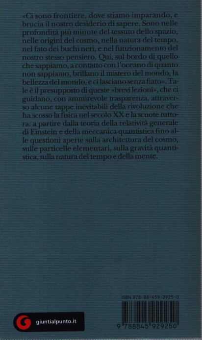 “Ci sono frontiere, dove stiamo imparando, e brucia il nostro desiderio di sapere. Sono nelle profondità più minute del tessuto dello spazio, nelle origini del cosmo, nella natura del tempo, nel fato dei buchi neri, e nel funzionamento del nostro stesso pensiero. Qui, sul bordo di quello che sappiamo, a contatto con l’oceano di quanto non sappiamo, brillano il mistero del mondo, la bellezza del mondo, e ci lasciano senza fiato”. Tale è il presupposto di queste “brevi lezioni”, che ci guidano, con ammirevole trasparenza, attraverso alcune tappe inevitabili della rivoluzione che ha scosso la fisica nel secolo XX e la scuote tuttora: a partire dalla teoria della relatività generale di Einstein e della meccanica quantistica fino alle questioni aperte sulla architettura del cosmo, sulle particelle elementari, sulla gravità quantistica, sulla natura del tempo e della mente.