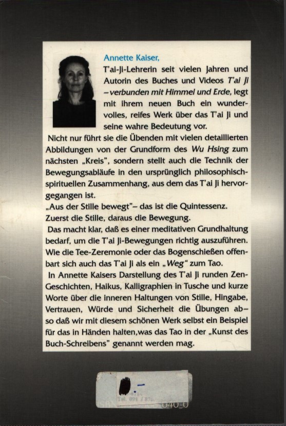 “Mossi dal silenzio”: questa è la saggezza e la quintessenza del T’ai Ji. Prima il silenzio, poi il movimento. Nella presentazione del T’ai Ji di Annette Kaiser, racconti Zen, haiku, calligrafie a inchiostro e brevi riflessioni sugli atteggiamenti interiori di quiete, devozione, fiducia, dignità e sicurezza completano gli esercizi, così che con questa splendida opera noi stessi teniamo tra le mani un esempio di ciò che potremmo chiamare il Tao nell'”arte di scrivere libri”.