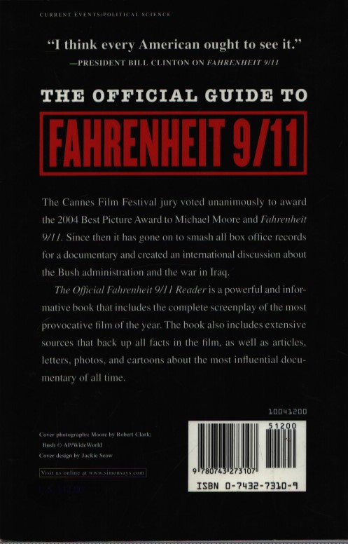 The Official Fahrenheit 9/11 Reader è un libro potente e informativo che include la sceneggiatura completa del film più provocatorio dell’anno. Il libro include anche ampie fonti che supportano tutti i fatti narrati nel film, oltre ad articoli, lettere, foto e vignette sul documentario più influente di tutti i tempi.