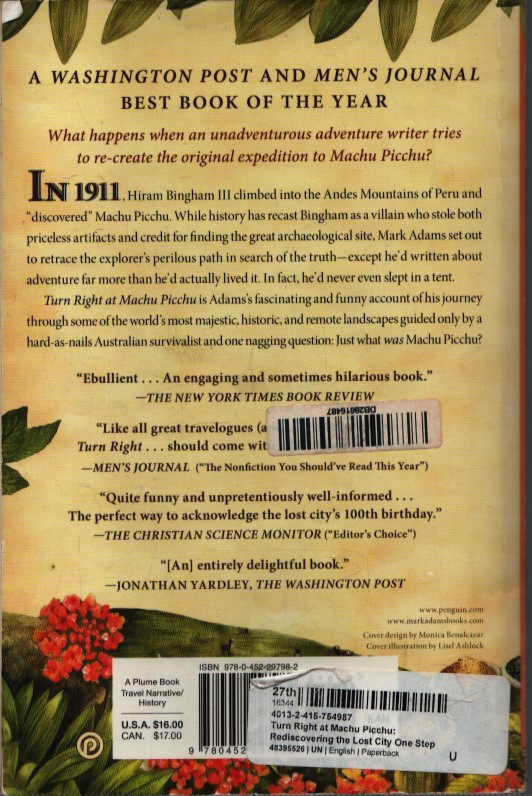 Nel 1911, Hiram Bingham III scalò le Ande peruviane e “scoprì” Machu Picchu. Mentre la storia ha ridisegnato Bingham come un criminale che rubò sia manufatti inestimabili sia il merito della scoperta del grande sito archeologico, Mark Adams si mise in viaggio per ripercorrere il pericoloso cammino dell’esploratore alla ricerca della verità, con la differenza che aveva scritto di avventure molto più di quanto le avesse effettivamente vissute. In effetti, non aveva mai nemmeno dormito in una tenda.