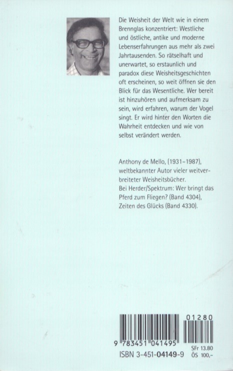 Le storie di Anthony de Mello parlano di noi stessi, dei nostri desideri, delle nostre speranze e, a volte, di coinvolgimenti comici. Questo maestro di saggezza spensierata attinge al Buddhismo Zen e ai racconti sufi, così come alla saggezza biblica e cristiana. Le sue storie illuminano la vita quotidiana in un lampo, proiettandola sotto una luce diversa e offrendo risposte sorprendenti.